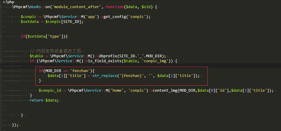 Conpic/Config/Hooks.php 文件 分站替换标识 ``` if(MOD_DIR == 'fenzhan'){ $data[1]['title'] = str_replace('{fenzhan}', '', $data[1]['title']); } ```